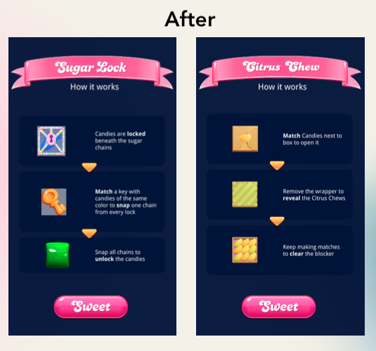 - Working with the UX and UI Designers, we redesigned the tutorial screen to make information easier to digest